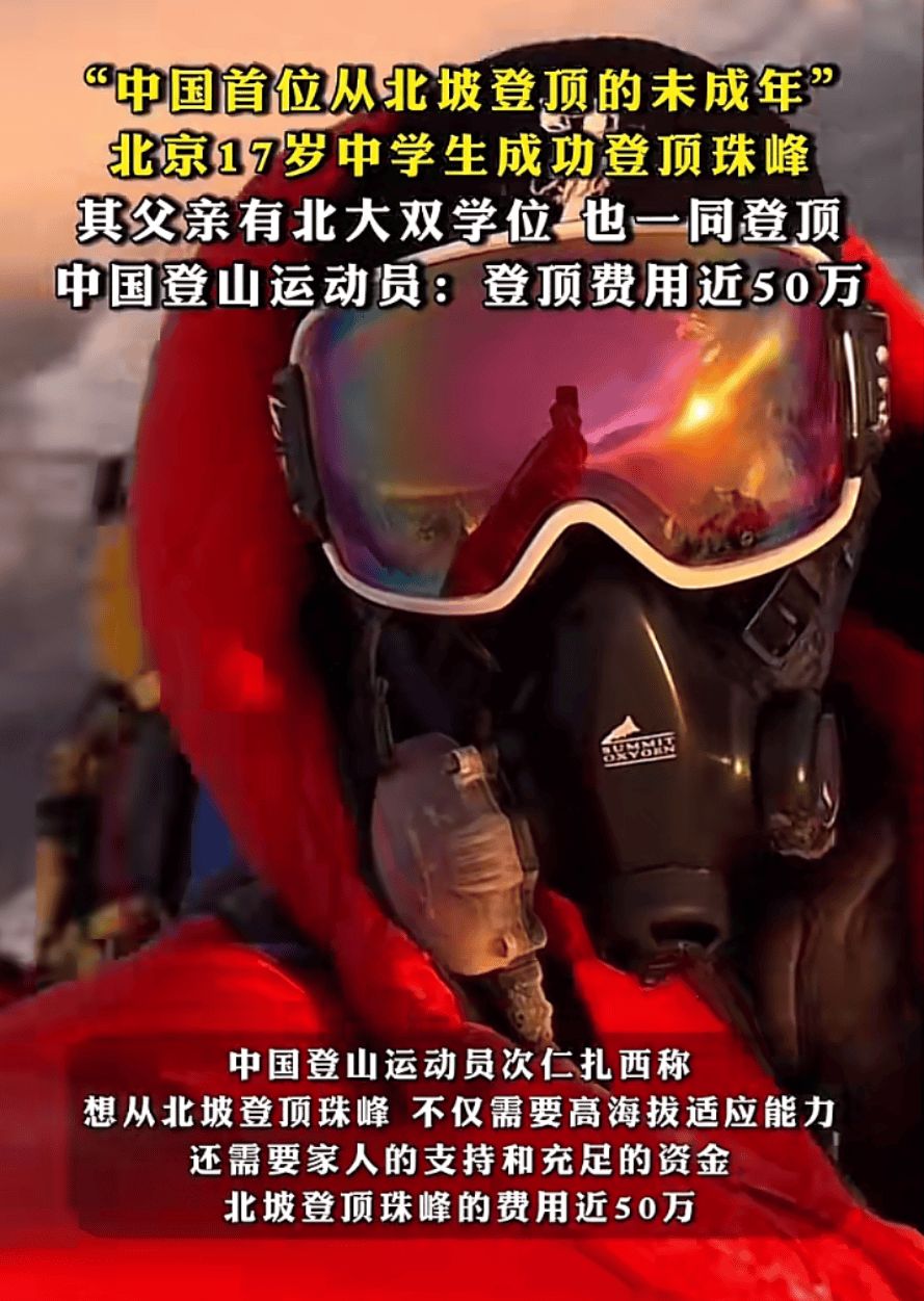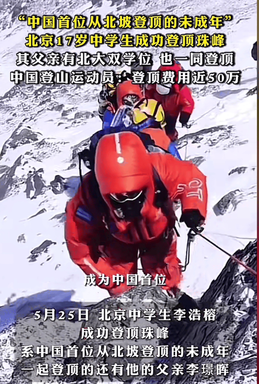 2025 年 5 月 25 日,北京中学生李浩榕(17 岁)站在珠峰海拔 8848.86 米峰顶,成为中国首位从北坡登顶珠峰的未成年男性,同时也是全球首位完成此壮举的中学生。与他一同登顶的父亲李璟晖 。
