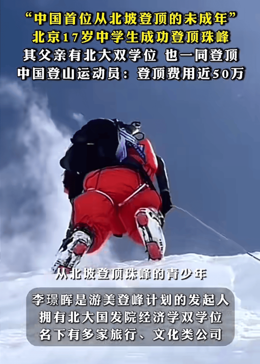 北坡登顶死亡率约 14%,但李浩榕的体能测试数据优于多数成年登山者,其成功是实力与准备的双重结果”。其父李璟晖也强调:“我们严格遵循《西藏自治区登山条例》,每一步都经过专业评估”。